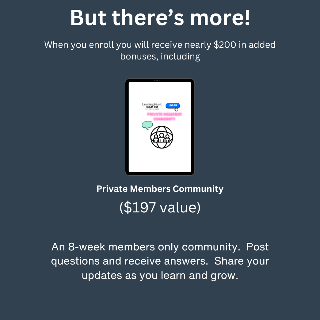 If you invest in Learning Music Inside Out and decide it’s not the right fit, I’ve got you covered. Simply reach out within 14 days of your start date, show me the work you’ve put in, and if you’re not seeing value, I’ll give you a full refund. I want you to feel confident in your investment and committed to your growth!