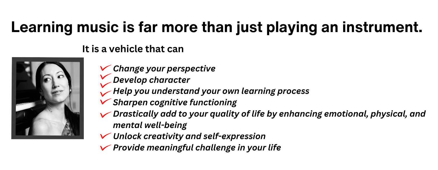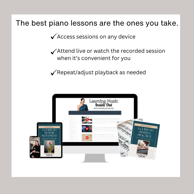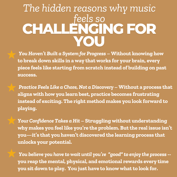 Hi, I'm Michelle.  Many adults come to me feeling insecure about learning music—not because they lack ability, but because they haven’t been shown how to recognize their progress.  They miss key opportunities and hold themselves back, stuck in the outdated myth that "you can’t teach an old dog new tricks."